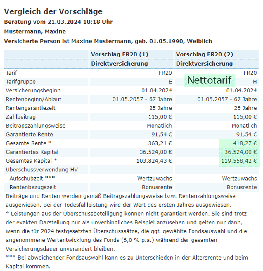 Bei Nettotarifen wird keine Provision für die Vermittlung der Policen abgeführt. Dadurch steht dieser Betrag zusätzlich für die Kapitalentwicklung über die gesamte Laufzeit zur Verfügung. Bis zum Ablauf der Police kann sich dadurch eine deutlich höhere Zusatzrente bzw. Ablaufsumme entwickeln.